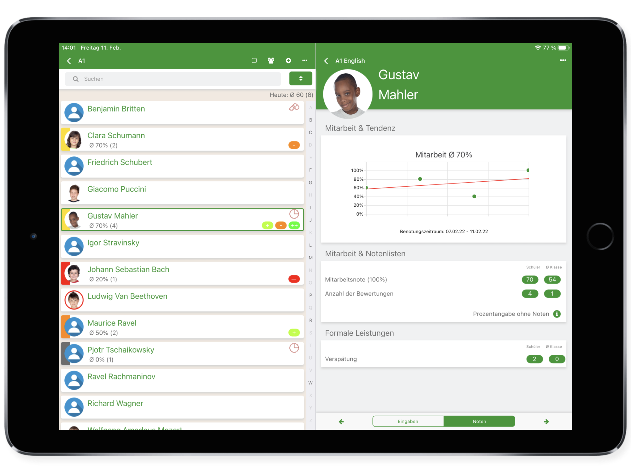 Mit dem Öffnen einer Klasse und einer Eingabe zu einem Schüler beginnt eine Unterrichtsstunde. Alle Eingaben werden einfach mit dem aktuellen Datum gespeichert. Auch für die Bewertung der Mitarbeit müssen keine Noten vorher angelegt werden, - sie können direkt eingegeben werden. Sonstige Unterrichtsleistungen, wie zum Beispiel ein Vokabeltest, werden einmal definiert und können dann mehrfach für Noteneingaben verwendet werden. Alle Eingaben starten beim Schüler, - im Sitzplan oder der Schülerliste, und werden dort für den aktuellen Unterrichtstag auf einem Bildschirm angezeigt. Am folgenden Tag finden sich die Eingaben auf den Detailseiten der Schüler*innen. Die Listen und der Sitzplan sind wieder frei von Eintragungen. Die Lehrkraft kann so leicht nachvollziehen welche Bewertungen sie für diesen Tag eingetragen hat.
