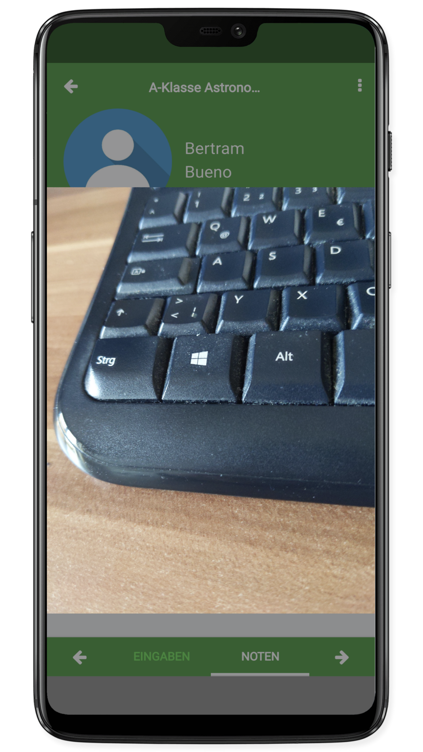 Man kann Bilder zum Unterrichtsverlauf (z.B. der Tafelanschrieb) und bei den Bemerkungen zu einem Schüler machen. Die Bilder können auch aus der Galerie in die App geladen werden. Jedes Bild braucht auch einen Text. Ohne Bemerkung wird das Bild nicht gespeichert. Es sind maximal 4000 Bilder möglich. Sie werden auf die Größe von 1 MB heruntergerechnet, so dass sich ein maximaler Speicherbedarf von 4 GB ergibt.