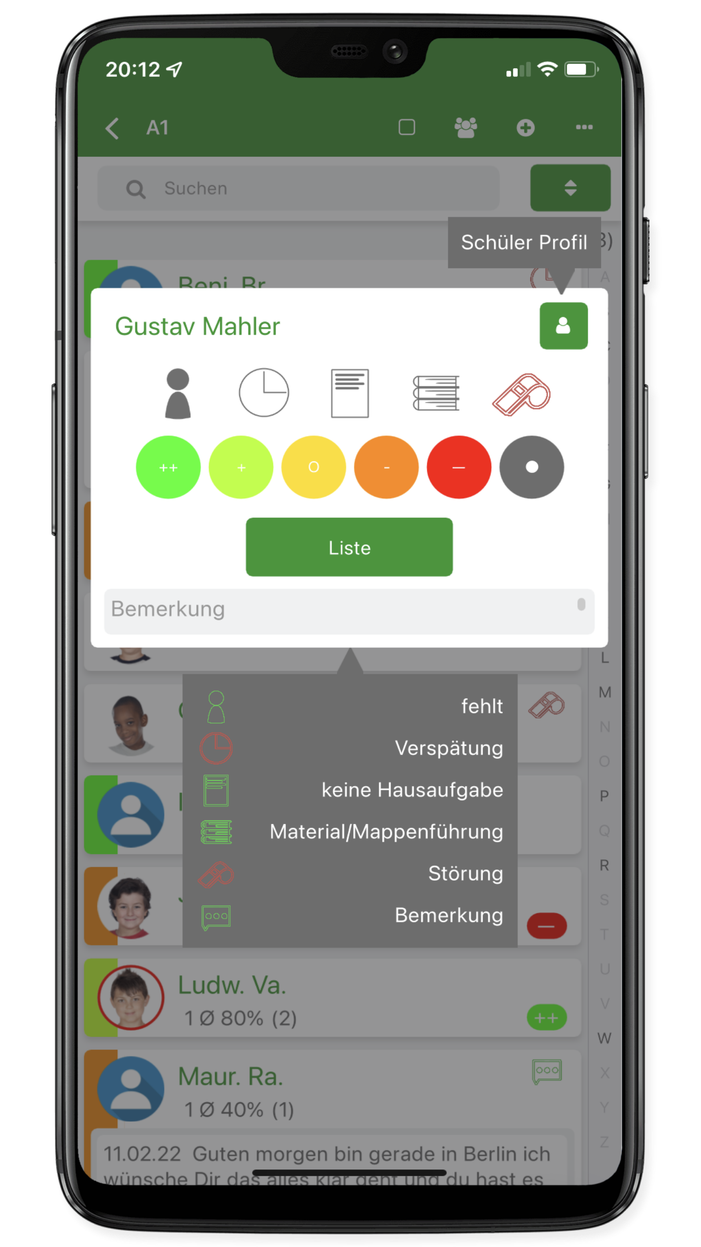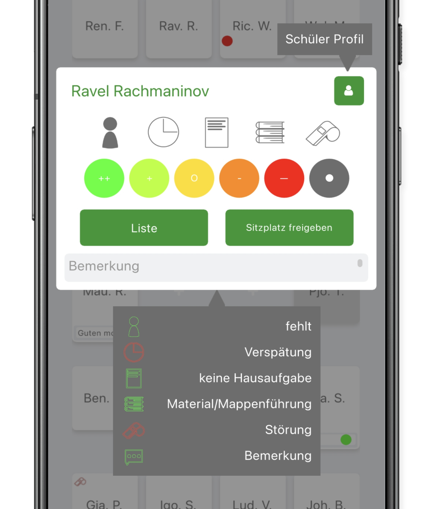 Alle Eingaben starten beim Schüler und werden für den aktuellen Unterrichtstag in der Schülerliste und im Sitzplan angezeigt.