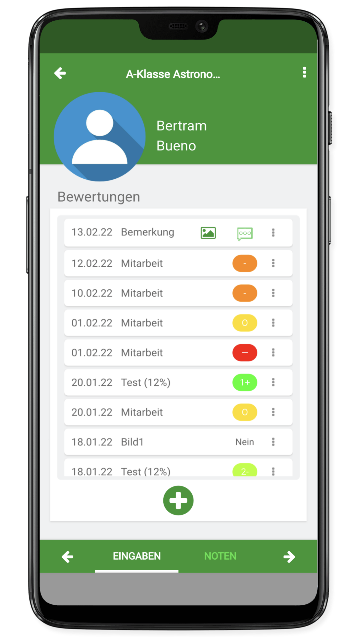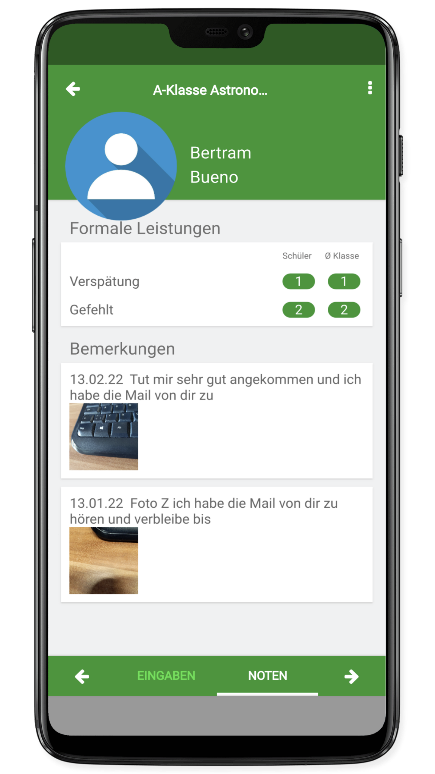 Man kann Bilder zum Unterrichtsverlauf (z.B. der Tafelanschrieb) und bei den Bemerkungen zu einem Schüler machen. Die Bilder können auch aus der Galerie in die App geladen werden. Jedes Bild braucht auch einen Text. Ohne Bemerkung wird das Bild nicht gespeichert. Es sind maximal 4000 Bilder möglich. Sie werden auf die Größe von 1 MB heruntergerechnet, so dass sich ein maximaler Speicherbedarf von 4 GB ergibt.