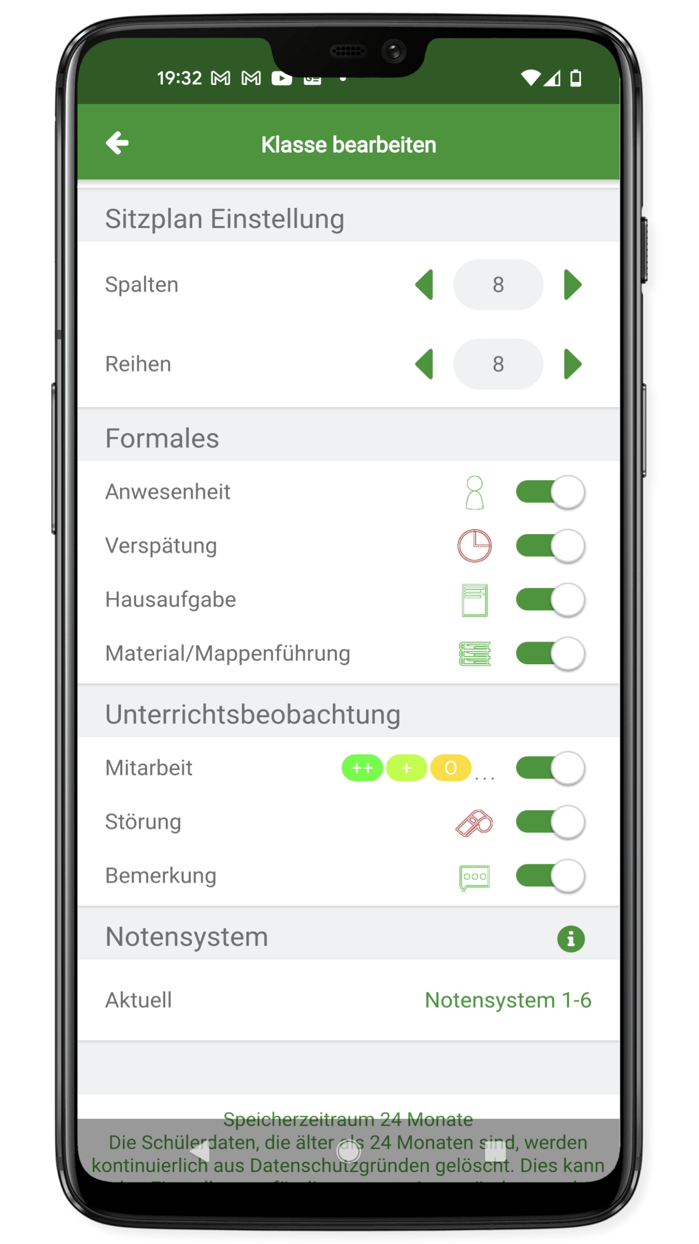 Bei den Einstellungen zur Klasse können die Reihen und Spalten des Sitzplans festgelegt werden. Ein Sitzplan mit acht Reihen und acht Spalten bietet 64 Sitzplätze für Schüler. Auf einem Tablet kann diese vollständig angezeigt werden. Auf einem kleineren Smartphonedisplay muss man hier scrollen. Aber vielleicht kann man die Sitzordnung auch mit weniger Reihen und Spalten darstellen.